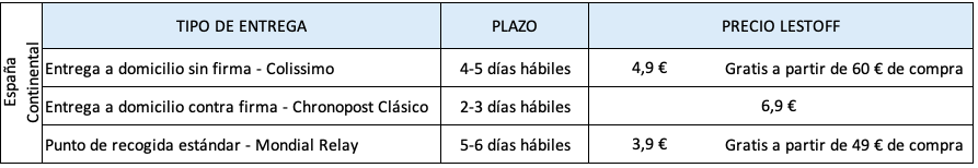 LeStoff envía los paquetes dentro de 24 a 48 horas, excluyendo sábados, domingos y días festivos. Los plazos y costos de entrega varían según el tipo de entrega elegido. En el cuadro que figura a continuación se detallan las diferentes tasas y métodos de entrega.